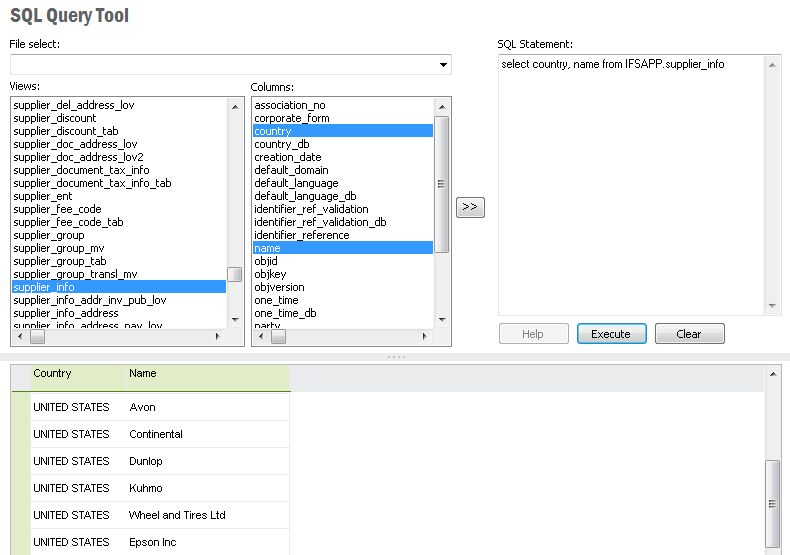 The tool can logically be divided in two parts, the upper part with user-controlled parameters to construct the query, and the lower part with a result table generated from the query. The View list shows all accessible views in the database, when populated. By selecting one of the views all it’s columns will be populated in the Columns list.