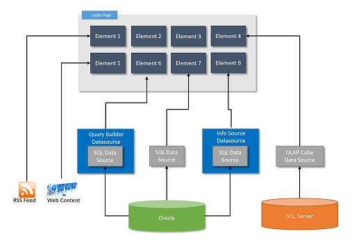 The Lobby concept is built up by Pages, Elements and Data Sources. A Page contains one to many Elements and each element is connected to one Data Source.