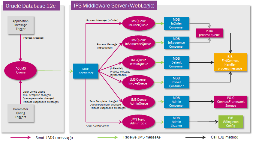 A Message Driven Bean (Forwarder MDB) subscribing to this JMS queue is processing messages posted on this queue. Depending on the type of received message the Forwarder MDB is forwarding the JMS message to another JMS queue or topic. Processing of single Application Message is performed by the Message Processor, which is called through an EJB, FndConnectHandler, in a separate transaction.