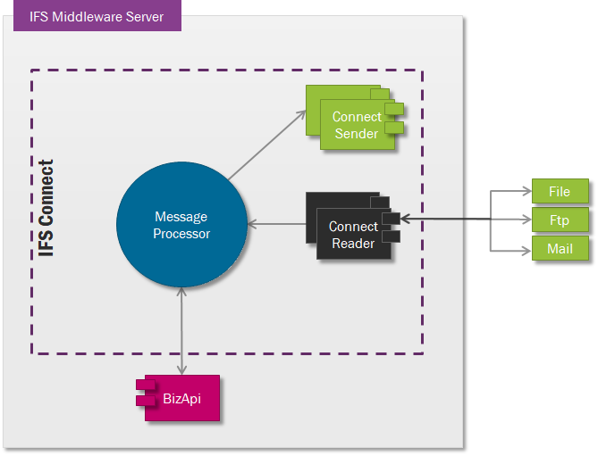 Connect Readers are used for receiving messages from other business systems, message hubs, output devices and so on. Processes implemented across systems may need to require information exchange that involves Connect Readers. Similarly to senders, readers will do the protocol adaptation to IFS internal protocol.