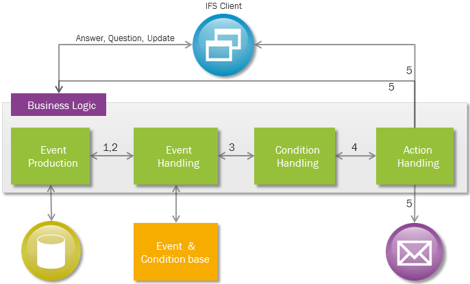 5. The Action handler is responsible for ensuring that all actions are executed in the correct manner. Actions can be sent to clients, to the business logic or some external source such as mail. This is handled through IFS Connect. If end users subscribe to any actions, then the action handler will send the appropriate actions to the subscribers as well as to the original receiver.