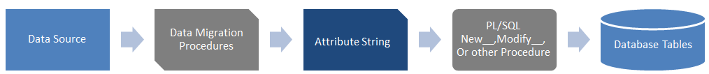 The data originates from a Data source. This can be a text file, Oracle source (table, view, db-link). Then a Data Migration Procedure converts this data into a attribute string(s). The content of the attribute string depends upon the configuration of the Migration Job. Then the attribute string is passed into New__, Modify__ methods. For other methods a dynamic procedure is created which takes the attribute string as input and then calls the actual method. These methods will do the relevant business logic validation and then save the data into the Database Tables.