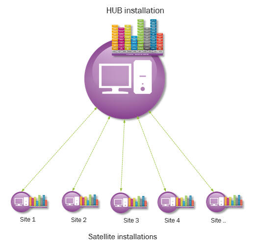 Each satellite installation is mapped to a site and hold data specific to the mapped site. Hub database hold data for all the sites. Synchronization of data between satellite and hub is done using IFS Connect messaging.