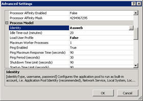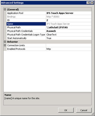 The IFS Touch Apps Server Application Pool must be modified to run as the Common User instead of Network Service. In IIS Manager, navigate to the Application Pools and click Advanced Settings for the IFS Touch Apps Server.