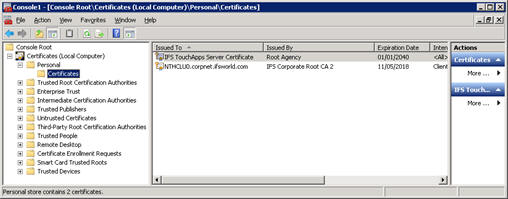 The IFS Touch Apps Server Certificate must be exported from the File Server and shared so that it can easily be imported on each Web Server. Using the Microsoft Management Console (mmc.exe), add the Certificates snap-in for the Computer account, managing the Local computer and browse to the Personal Certificates.