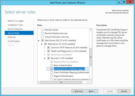 On Windows Server 2012 or 2016 (all web servers), ensure that “Centralized SSL Certificate Support” is installed.