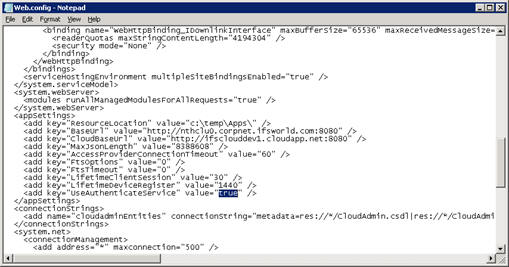 For Push Notification, IFS Apps Server is informed how to call the TAS using the BaseUrl setting in Web.Config. This URL should identify the TAS Load Balancer. You must repeat this change every time you upgrade Touch Apps Server.