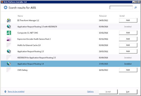 Install IIS on the Load Balancing Server as detailed above. Use the Web Platform Installer to install the latest version of Application Request Routing (ARR).