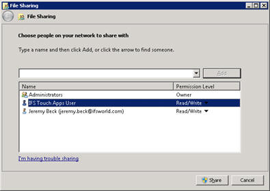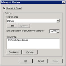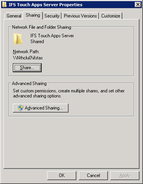 The TAS Installer creates the web content in C:\inetpub\IFS Touch Apps Server. This folder must be shared so that the web servers can access it. The share name must not include spaces so use the folder properties Advanced Sharing form to create the share.