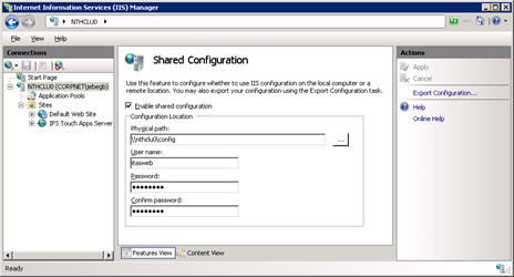 Install IIS on the web server as detailed above. If using a local common user, create it and add it to the IIS_IUSERS group. Using IIS Manager, enable Shared Configuration on the IIS Server. Restart IIS Manager and restart IIS. Check that the web site is served by the new web server.