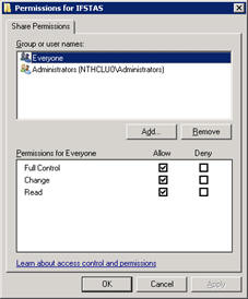 The Share permissions are open. Security is imposed using the Folder Security properties.