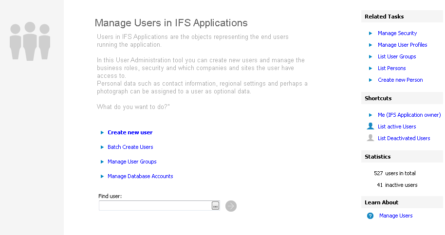 You find the User Management page by selecting the Users folder in IFS Solution Manager / Security.