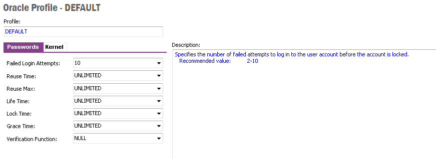 | Failed_Login_Attempts | Specify the number of failed attempts to log in to the user account before the account is locked. |