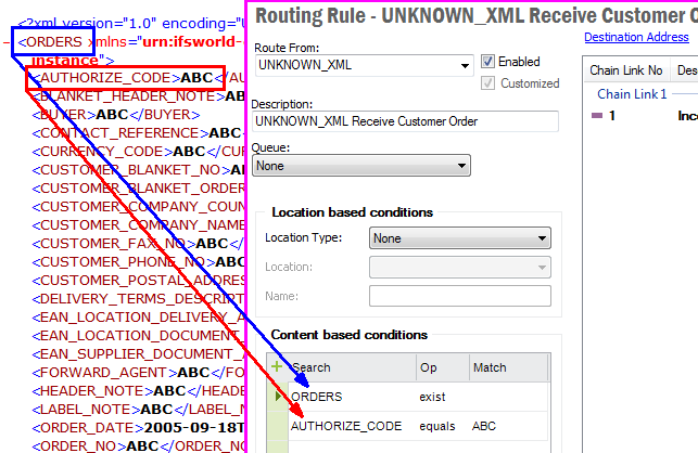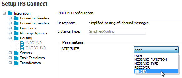 The identification of an inbound message is done by looking at the attribute value of a node of an xml file or any string in a non xml file. The Route From defines the format of the file i.e. whether the file is an xml file, xml file with an envelop or non xml file. The default values in the drop down are