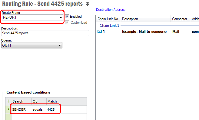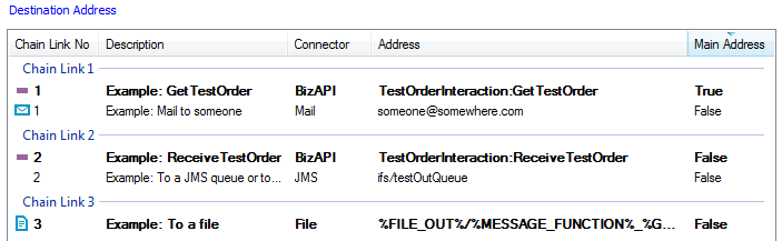 Shows a list of all Destination Addresses grouped in address chain links. A Destination Address defines a destination where the message is to be sent if all of the the conditions match.