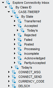 Connectivity Inbox can be explored using two main categories Class ID and State. The State Category has a sub category Today's. which will retrieve the messages received during the day in the selected message state. The Class ID category will list all the registered class id's in the system. Each class id has two sub categories State and Today's. This makes it very convenient for system administrators to explore messages with specific criteria.