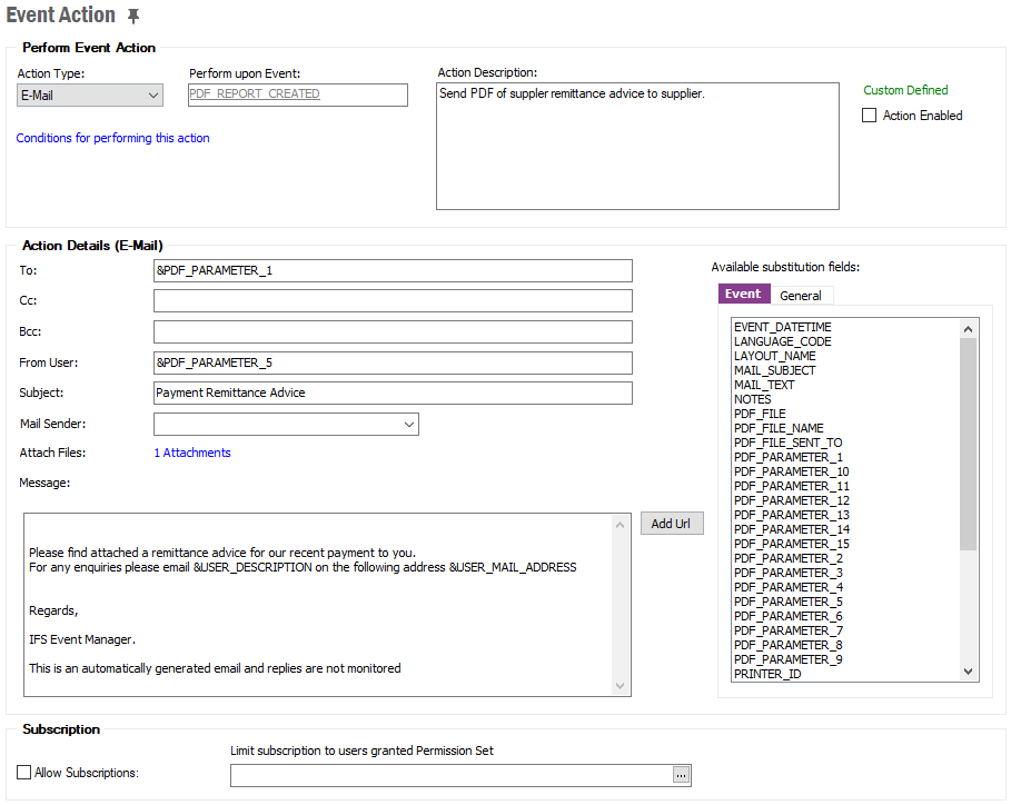 The following is an example of how to setup the event. You can use any available event parameters (PDF_PARAMETER_1 - PDF_PARAMETER_10) you want when setting up the event provided that you have passed the necessary values for the parameters from your application code. Values for the other event parameters such as REPORT_ID, REPORT_TITLE, LANGUAGE_CODE etc. are passed through the framework.