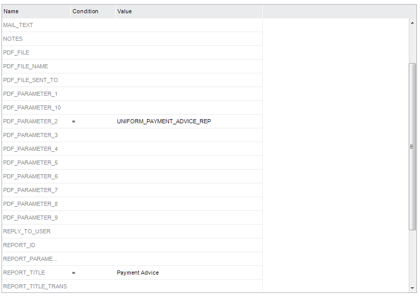 Defining default values for event parameters of the above PDF_REPORT_CREATED event can be done in Report Definition file (.rdf) of each report. Default values for PDF_PARAMETER_1 to PDF_PARAMETER_10 can be defined this way using interface in PdfReportEventParam logical unit.