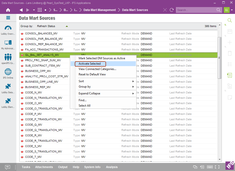 Information Source access based on Materialized Views is not a common source when setting up Analysis Models. The disadvantage with Materialized Views is that the IFS implementation only supports complete/full refresh.