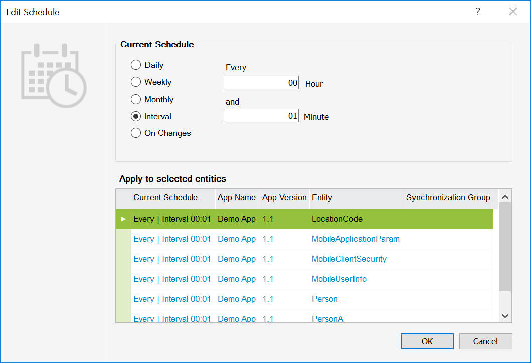Each Entity is defined with a Default Schedule. This can be overwritten by using the context menu Edit Schedule. This opens a dialog box that will allow the Entity to be synchronized:
