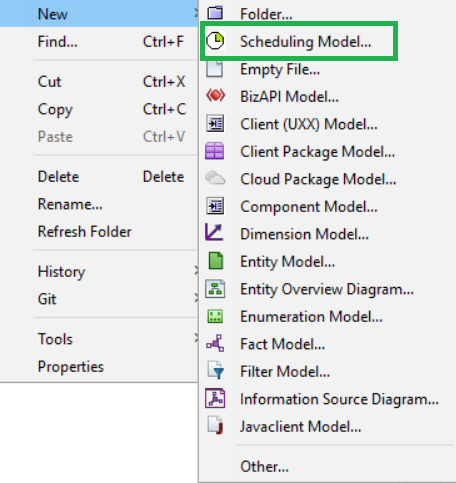 To start creating a scheduling model, right-click on any folder to create a new scheduling model (as screenshot below). This will open a 'New Scheduling Model' dialogue you can define the name of the model, the project it will be created in, the component, file location etc.