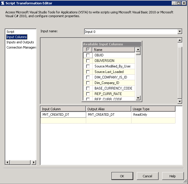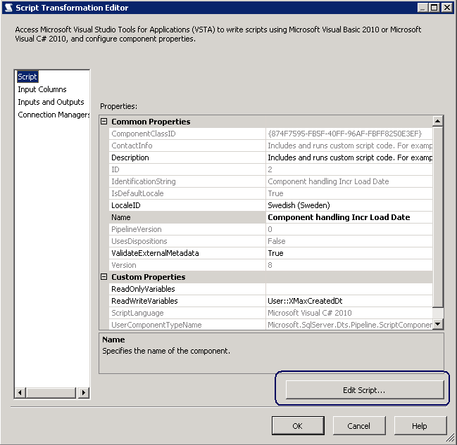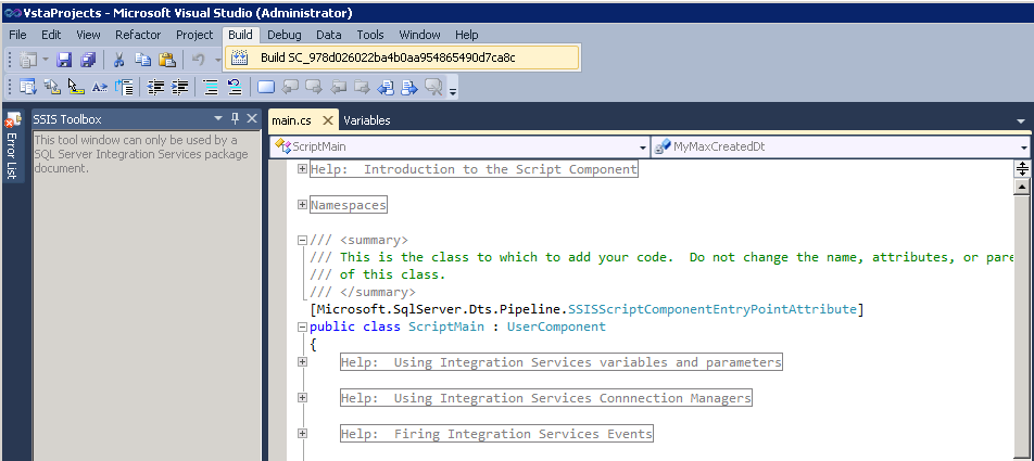 Use an existing SSIS package that supports incremental load as a template. Select the Script Component and then just copy it in to the target Dm SSIS package.