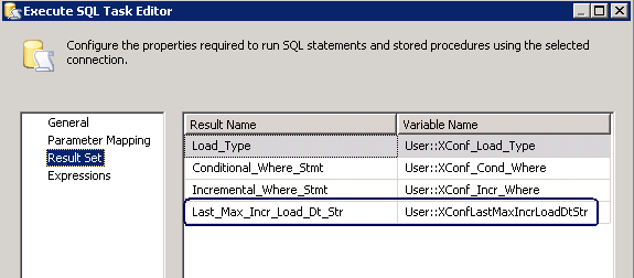 The Execute SQL task that gets configuration settings should be updated to select the current value the column Last_Max_Incr_Load_Dt_Str from the configuration table for the current source.